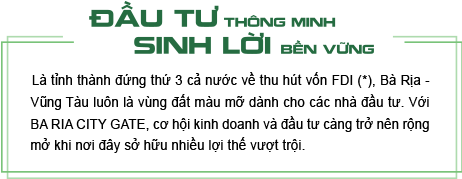 Tại BA RIA CITY GATE, chúng tôi kiến tạo một khu đô thị lý tưởng với những giá trị hoàn hảo để đầu tư và an cư với quy mô lớn, quy hoạch chỉn chu, bài bản hàng đầu tại thành phố Bà Rịa.Sở hữu vị trí đắt giá tại thành phố Bà Rịa nhộn nhịp và sầm uất, nơi giao thoa liên vùng TP.HCM – Đồng Nai – Bình Thuận và hướng về “trái tim du lịch biển” Vũng Tàu, BA RIA CITY GATE đánh thức tiềm năng của một thành phố năng động đang trên đà phát triển mạnh mẽ.