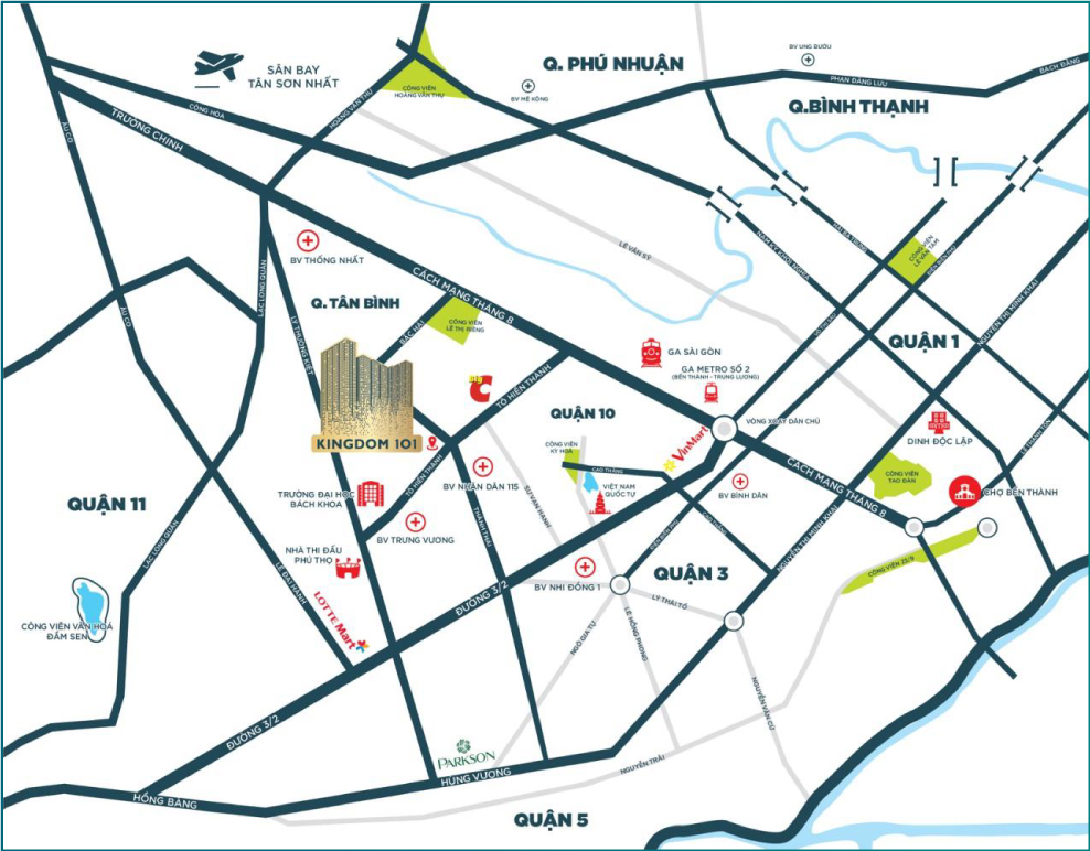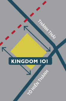 Tọa lạc tại: 334 Tô Hiến Thành, Phường 14, Quận 10, TP. Hồ Chí Minh Với sứ mệnh đem đến không gian sống đẳng cấp giữa lòng thành phố, dự án căn hộ cao cấp Kingdom 101 sở hữu vị trí “kim cương” tại số 334, đường Tô Hiến Thành, Phường 14, Quận 10, TP.HCM. Kingdom 101 kết nối thuận lợi với nhiều tuyến đường huyết mạch của Quận 10: Đường 3/2, Cách mạng tháng 8, Cao Thắng,… Từ đây, cư dân dễ dàng tận hưởng nhiều tiện ích hiện đại ở Quận 1, Quận 3, Quận 5.