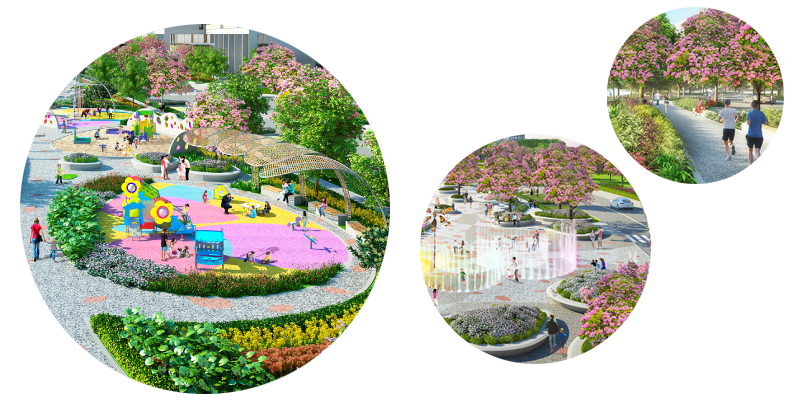 Điểm nhấn ấn tượng nhất ở MONA MEDIA MIDTOWN chính là SAKURA PARK đầu tiên và duy nhất tại Việt Nam. Được thiết kế bởi Landsculptor Studio – đơn vị thiết kế cảnh quan nổi tiếng từ Thái Lan, với những con đường rợp bóng hoa anh đào, SAKURA PARK mang đến cho cư dân khung cảnh thanh bình và yên tĩnh cùng nhiều không gian cộng đồng phù hợp với mọi lứa tuổi như khu vui chơi trẻ em, khu công viên yên tĩnh cho người thích đọc sách, những đồi cỏ trong lành cho những buổi picnic gia đình, quảng trường nước Sakura Plaza hay khu thể thao đa chức năng cho người thích vận động… Trong tương lai không xa, nơi đây sẽ được phát triển thành địa điểm mang tính biểu tượng thứ hai của khu đô thị Mona Media, bên cạnh khu Hồ Bán Nguyệt – Cầu Ánh Sao sầm uất.